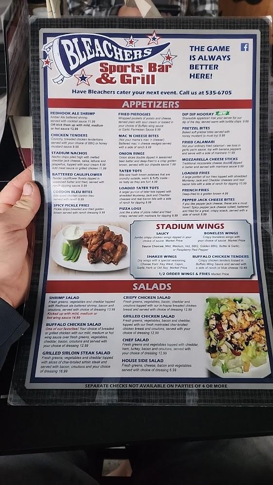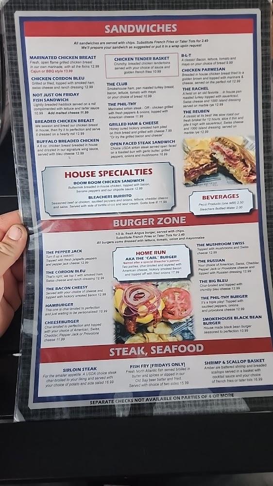 For main courses, juicy burgers and steak platters dominate. For seafood lovers, the shrimp and scallop basket is a must-try. The drink menu features an extensive range of beers and cocktails, ensuring everyone can find their perfect pair. Overall, the menu's variety accommodates cravings, making Bleachers a delightful stop for food lovers.